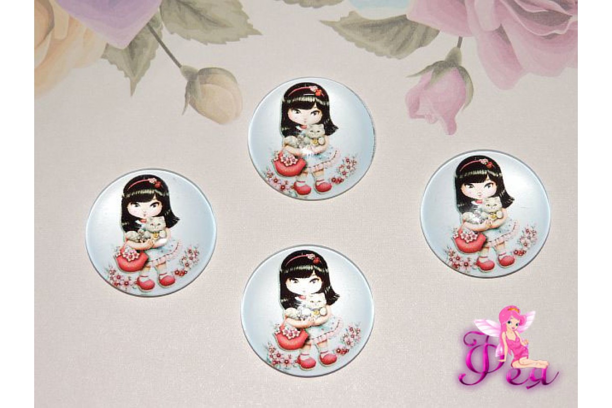 Кабошон стеклянный с рисунком 25 мм "Девочка с котиком" - 1шт, 256-477, Китай, Кабошоны стекло с рисунком