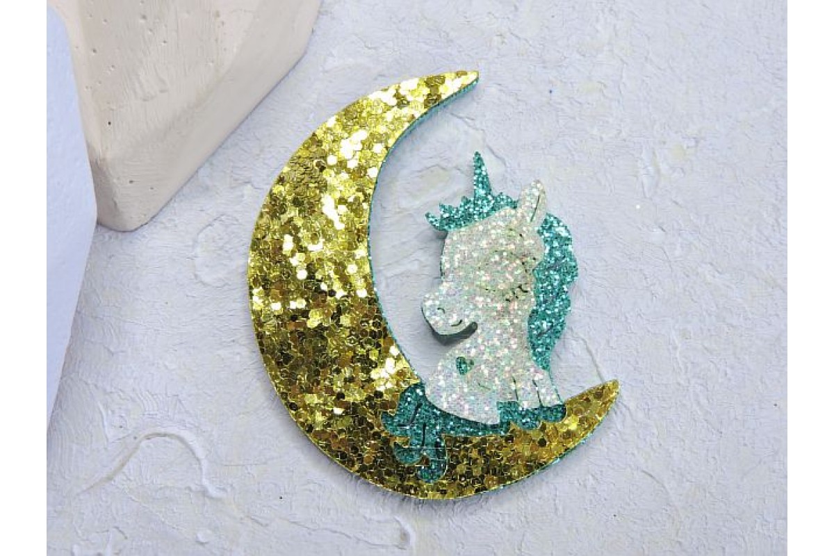 Патч сборный "Единорог на луне", 50*40 мм, цв.бирюзовый-золото - 1 шт. Материал: основа - глиттерный фоамиран, верх - кожзам. Состоит из нескольких частей.