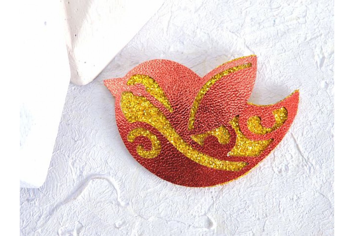 Патч сборный "Птичка", 50*34 мм, цв. золотисто-красный - 1 шт. Материал: основа - глиттерный фоамиран, верх - кожзам. Состоит из нескольких частей.