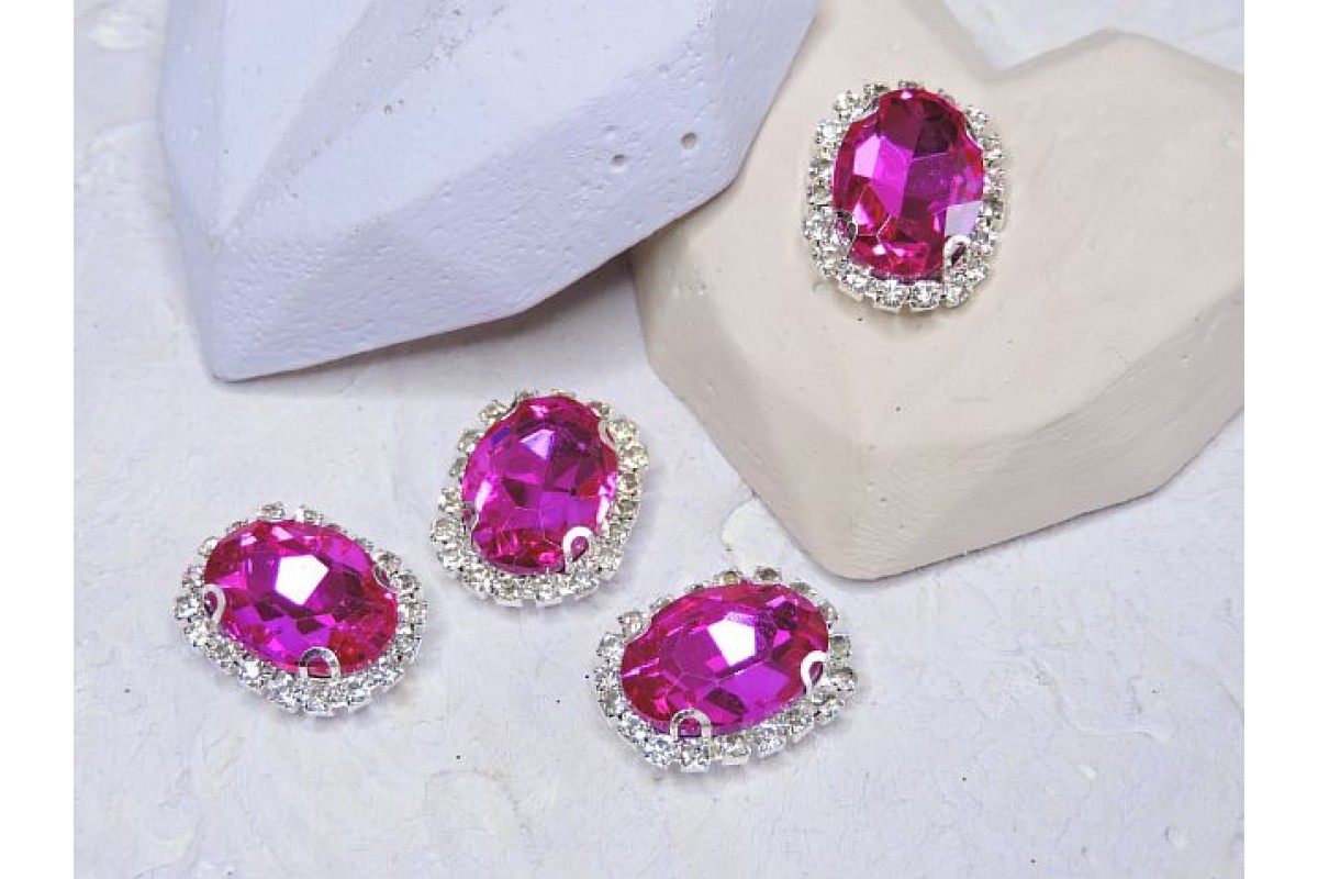 Страза пришившая в серебряной оправе 17*22 мм "Овал", цв. фукси - 1 шт.