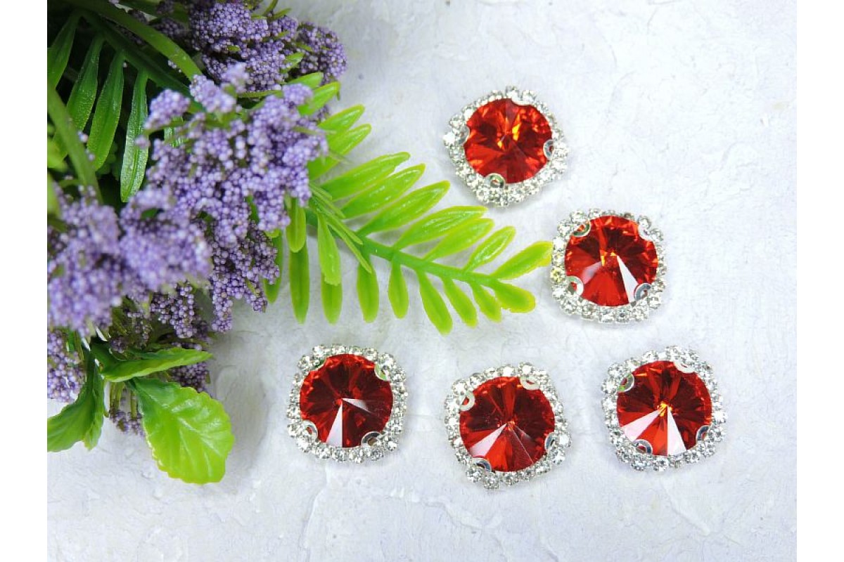 Страза пришившая в серебряной оправе 18 мм "Круг", цв. красный - 1 шт.