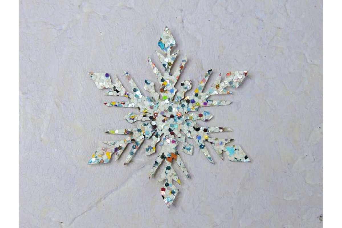 10031, Заготовка-патч из кожзама "Снежинка с острыми кончиками", цв. белый с цветными блестками - 1 шт., , 0.42BYN, 50*555, Беларусь, Заготовки из фоамирана и кожзама