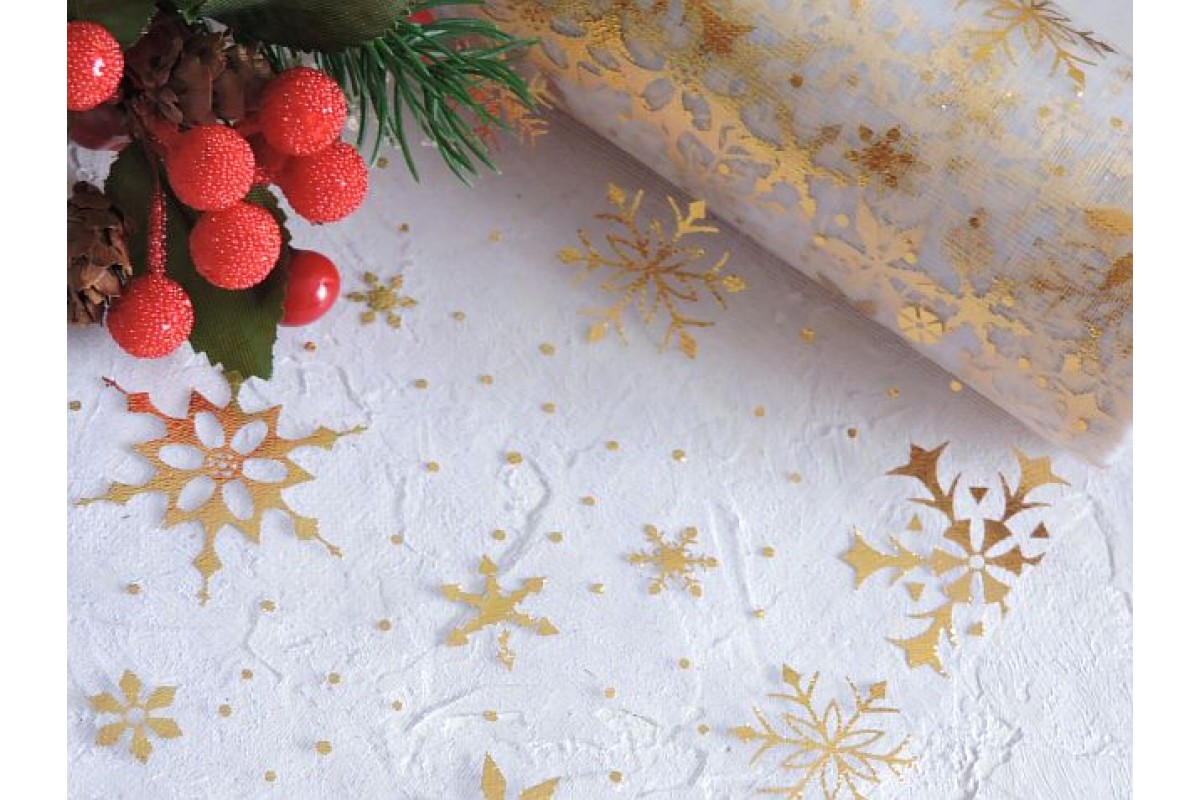 Фатин "Снежинки" 15 см, цв. белый/золото - 1м.