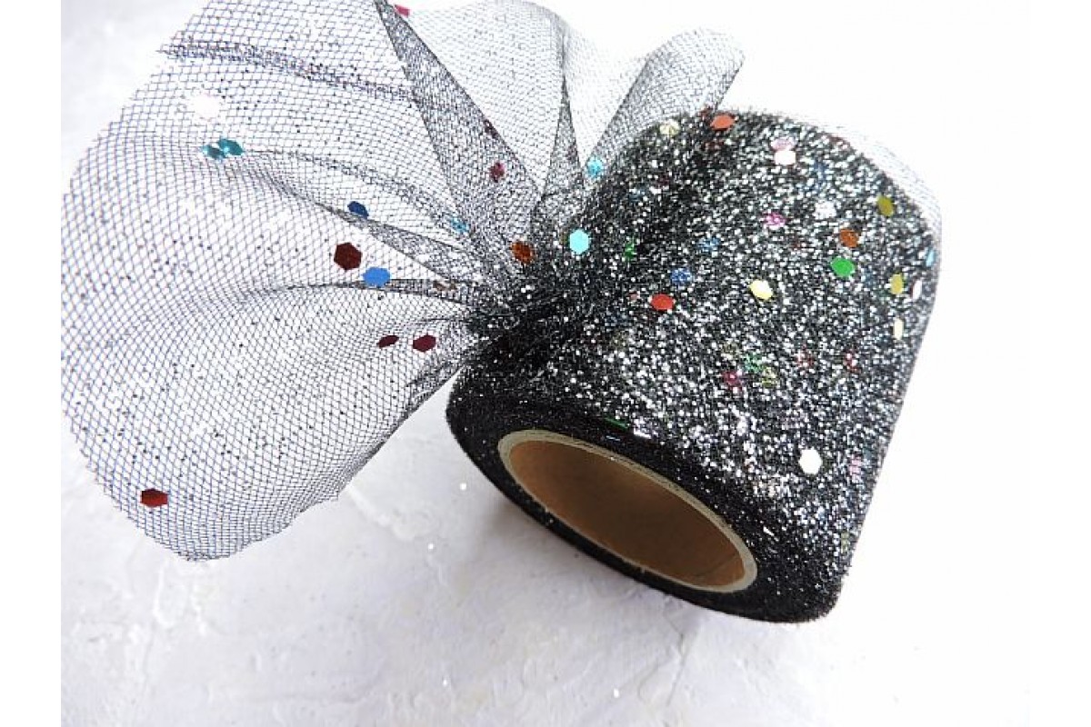 Фатин с блестками и пайетками 5,5 см, цв. черный - 1 м.