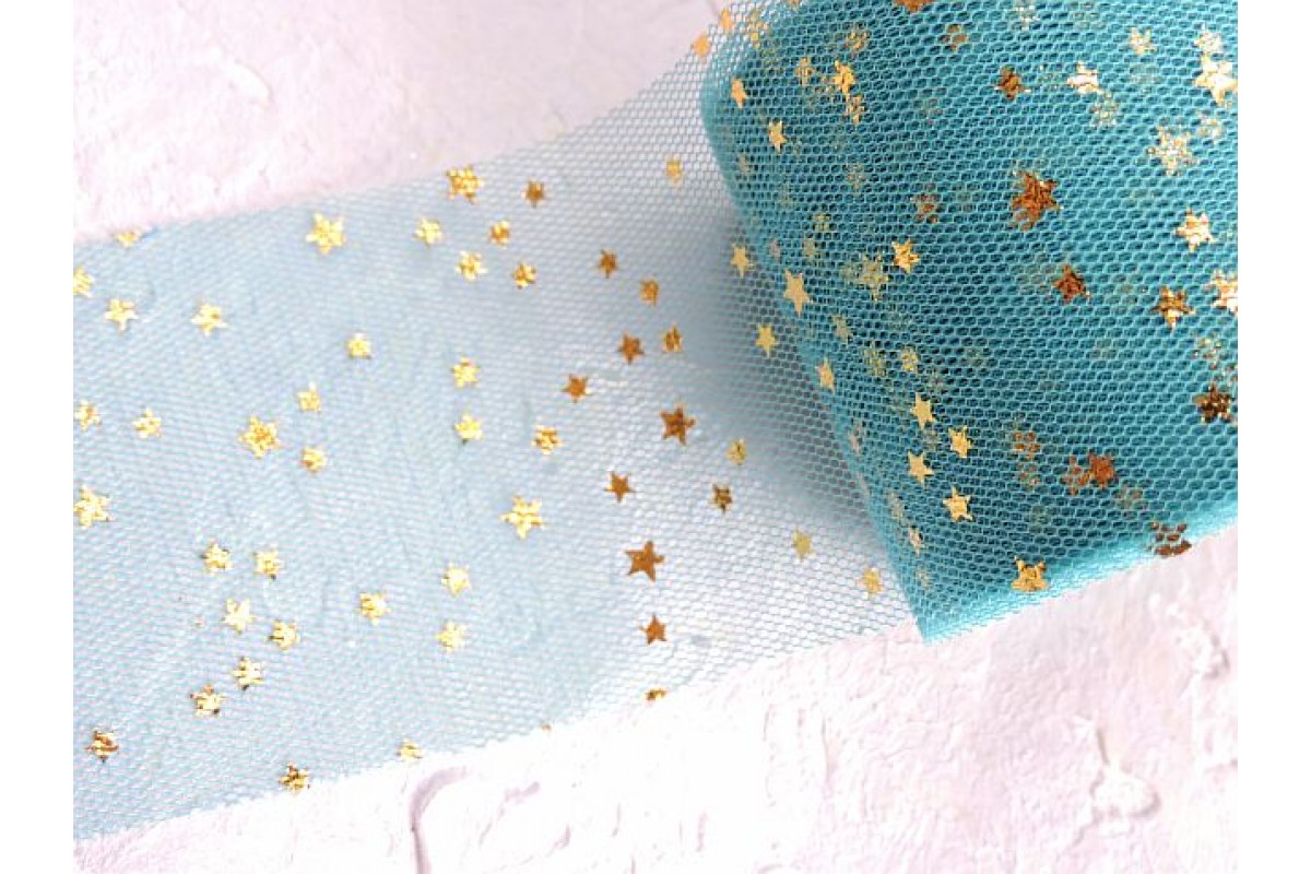Фатин "Звездочки" 5, 5 см, цв. темно-бирюзовый/золото - 1 м., 803-480, Китай, Фатин 5