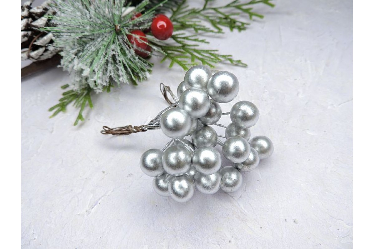 Ягоды на веточке глянец 10 мм , цв. серебро - 1 пучок.