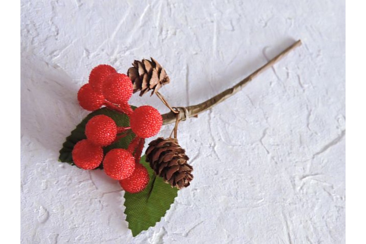 Веточка декоративная 15 см "Ягодки с шишками" цв. красный - 1 шт.