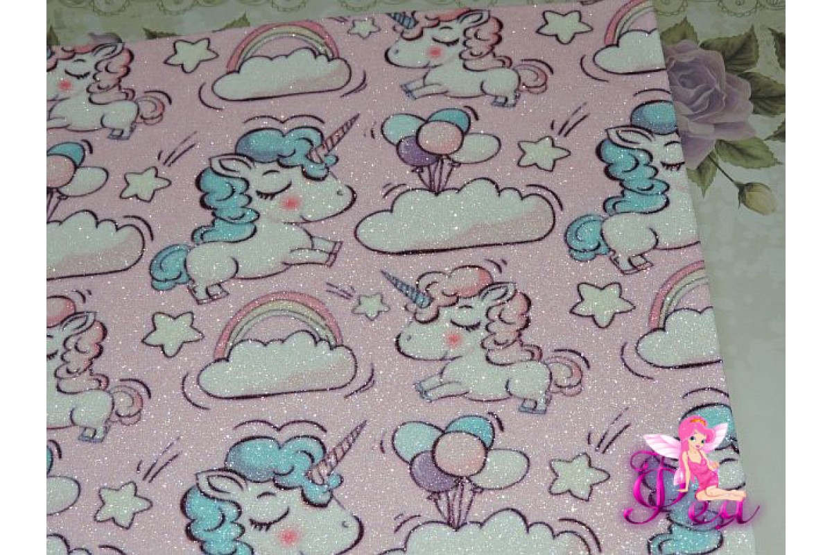 Кожзам с блестками "Единороги", розовый, 232-167, Китай, Кожзам декоративный