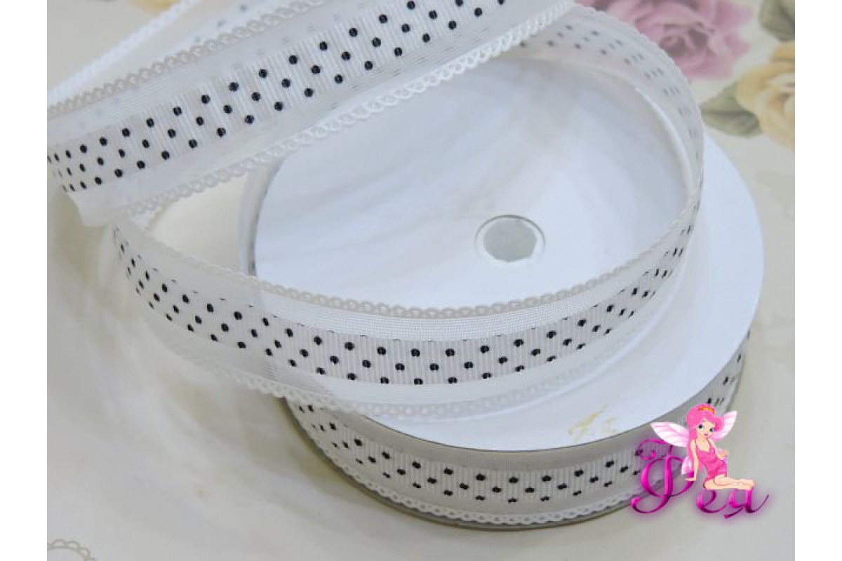 Декоративная лента, 25мм со вставкой белого цвета с рисунком "Горох" и белой каймой по краю - 1м