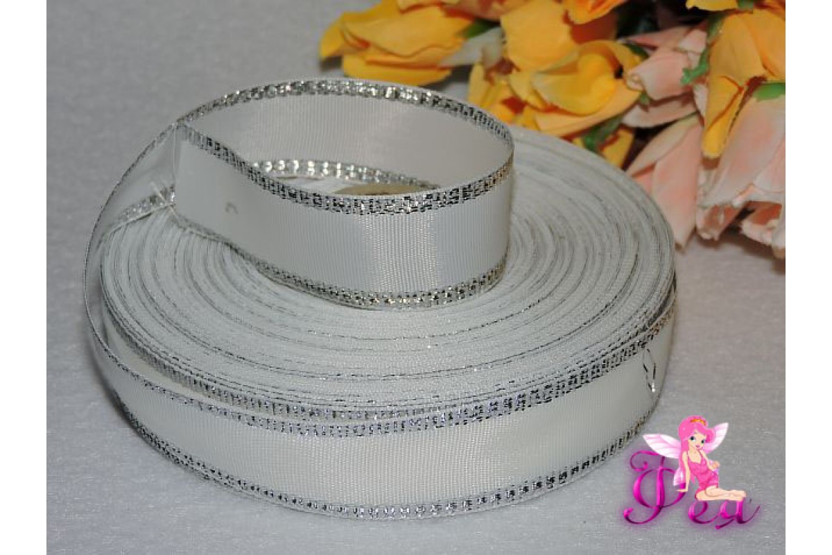 Декоративная лента 25мм белого цвета с серебряной нитью по краям