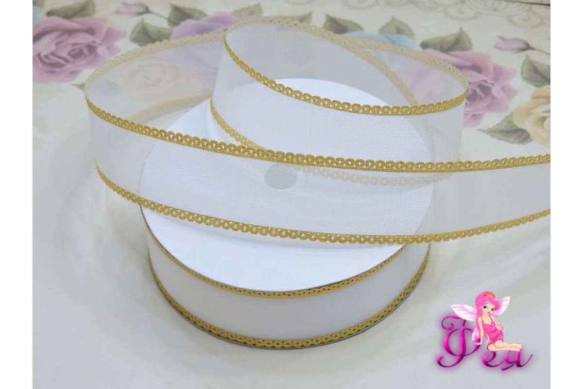Декоративная лента 25 мм белого цвета с золотистой каймой по краю - 1м