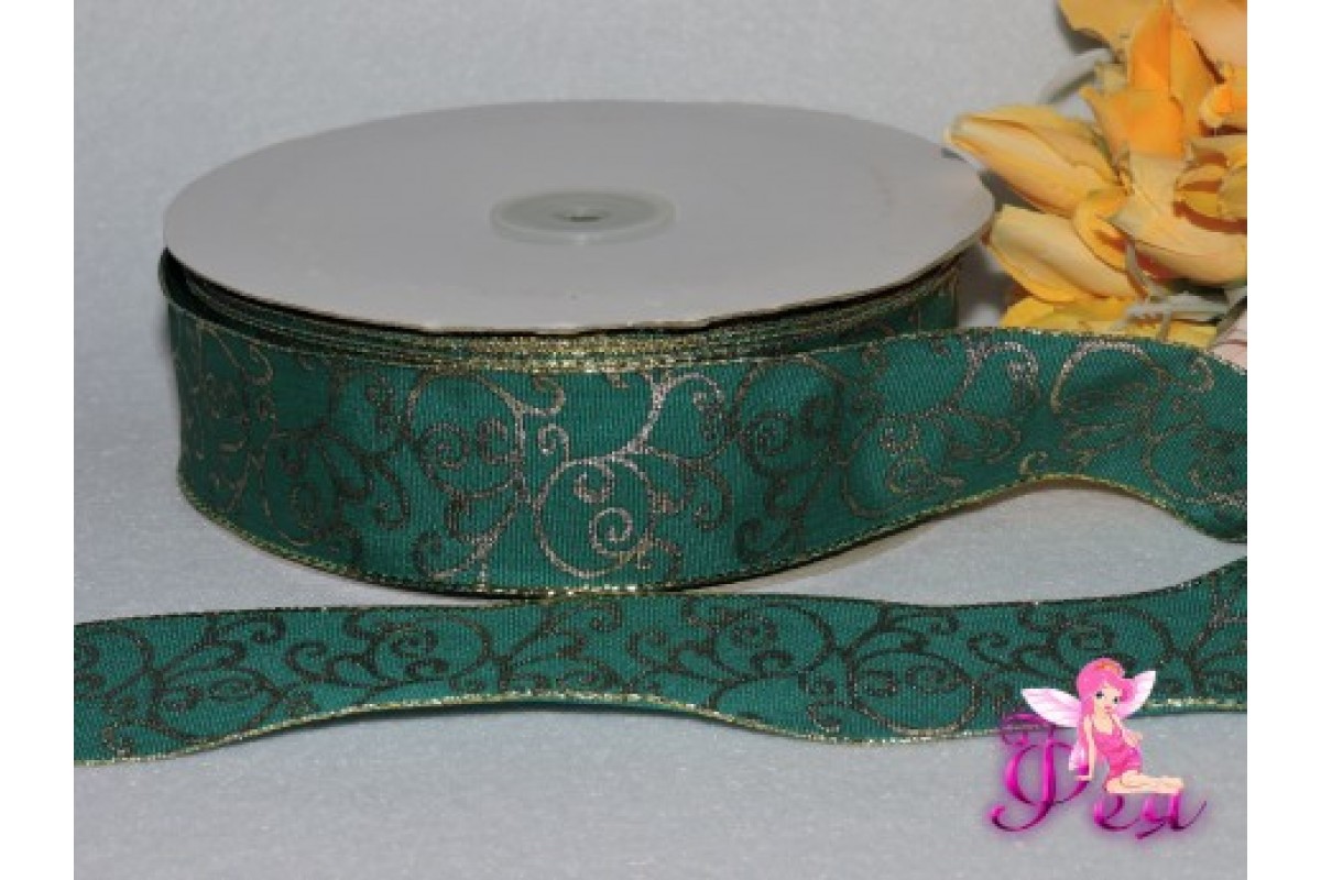 Лента декоративная 38 мм с золотым рисунком , цв. изумрудный ( с проволокой по краям)