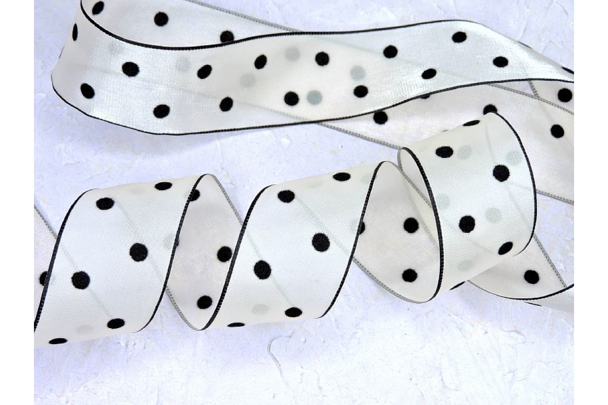 Лента 38 мм органза с черными бархатными горошками и окантовка, цв. айвори - 1 м.