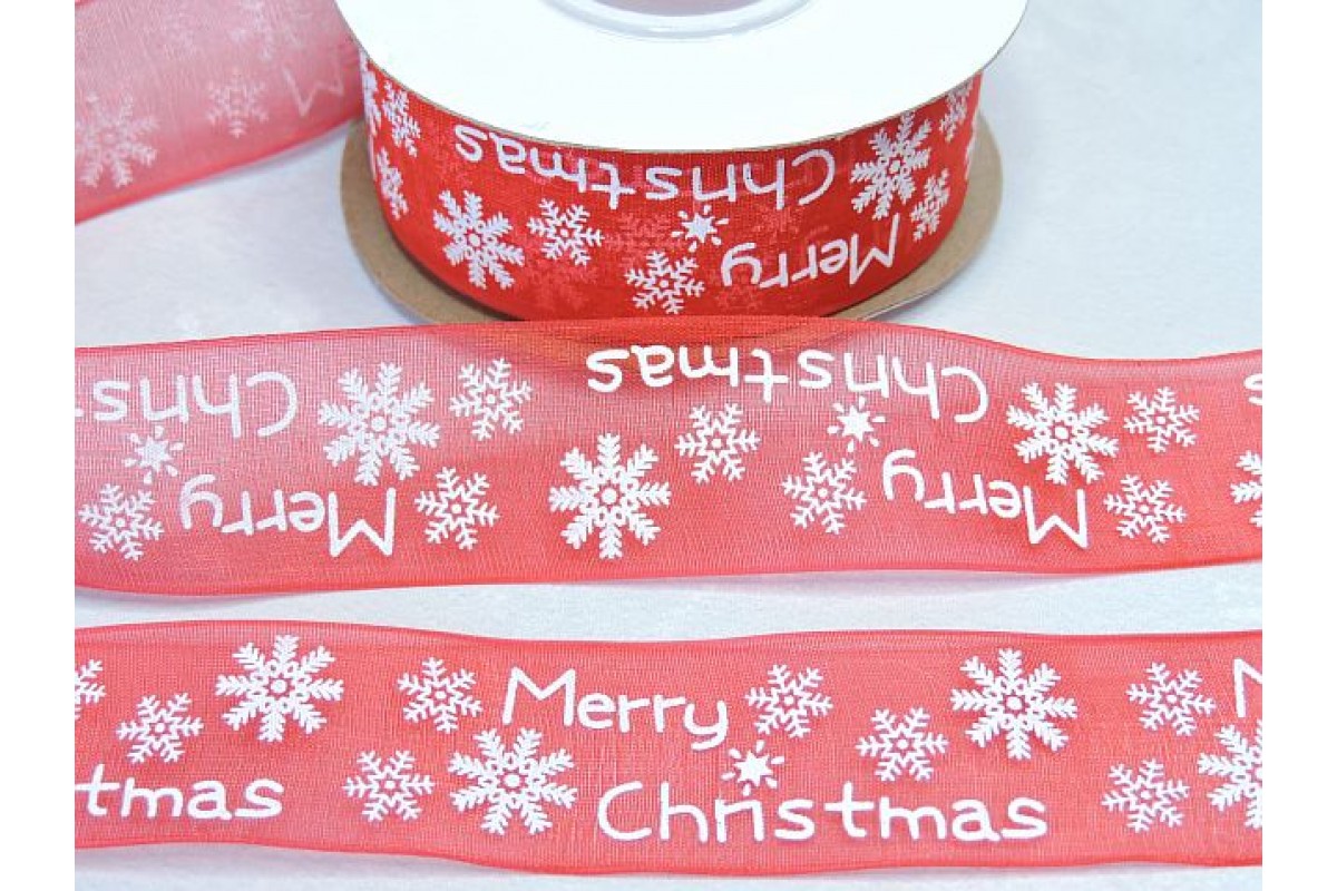 Лента органза 25 мм, "Merry Christmas", красный - 1 м., 28-271, Органза