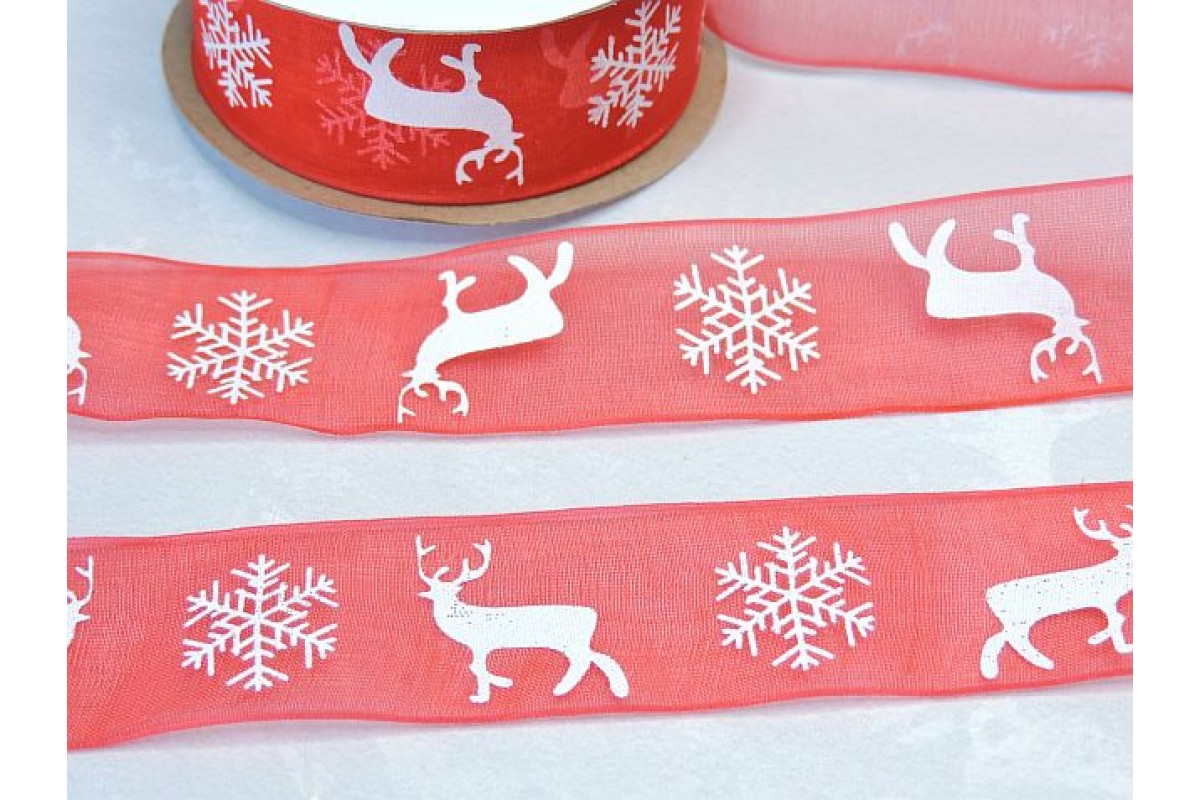 Лента органза 25 мм "Олени". цв. красный - 1 м.