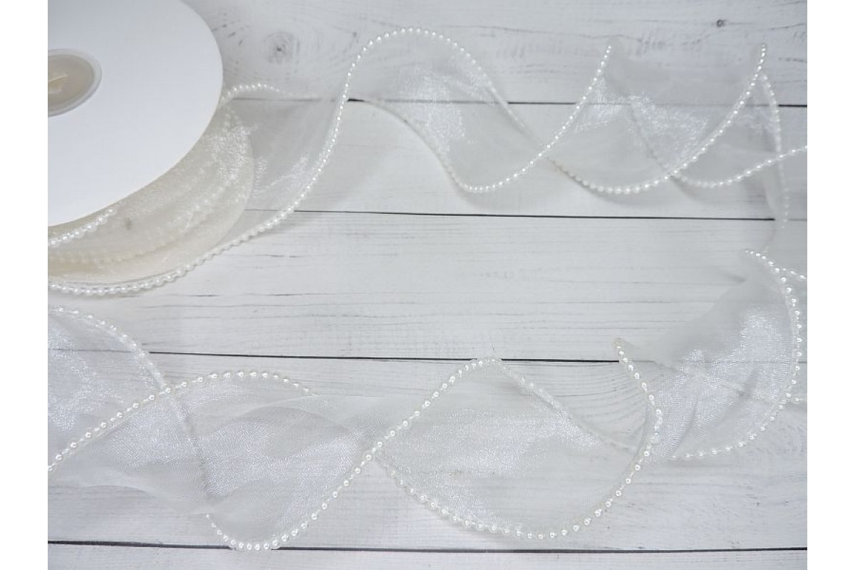 Лента органза 5 см с декоративным швом и бусинами, цв. айвори - 1 м.