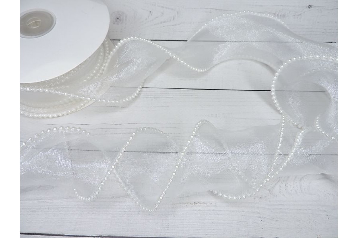 Лента органза 5 см с декоративным швом и бусинами, цв. белый - 1 м.