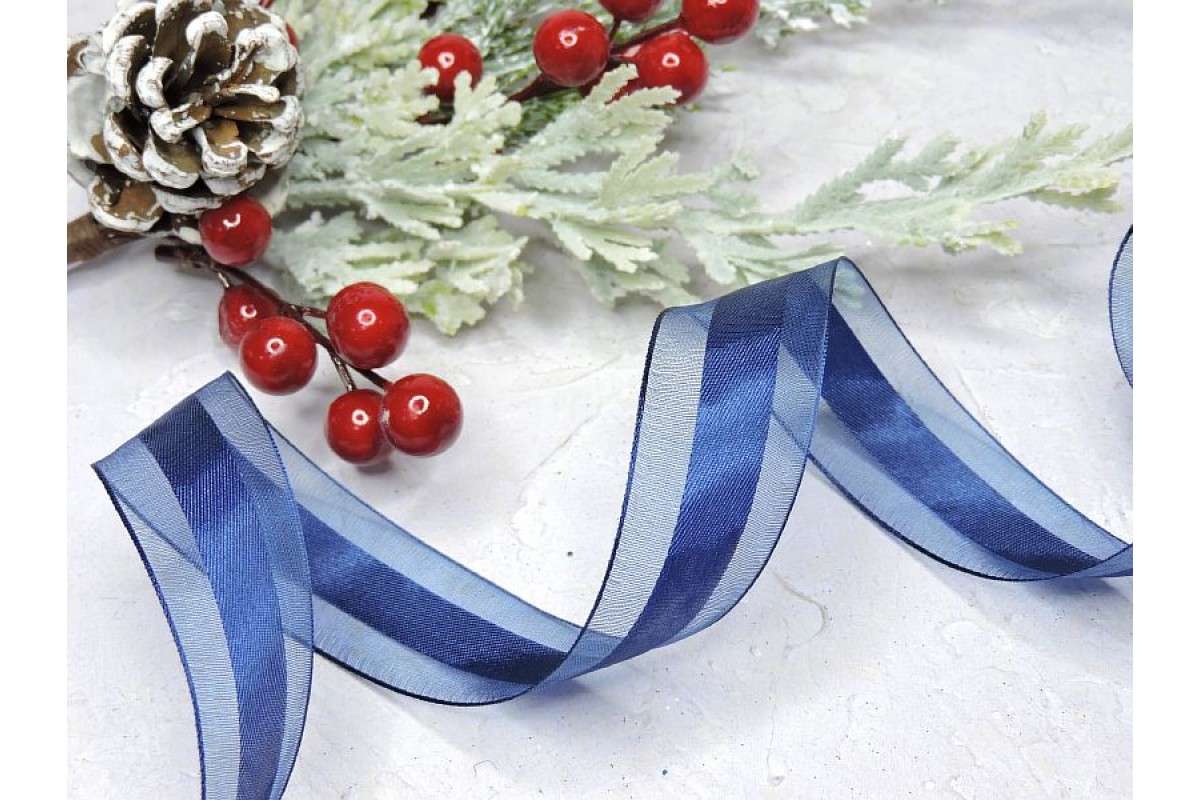 Лента органза с атласом 25 мм по середине полоска, цв. темно-синий - 1 м.