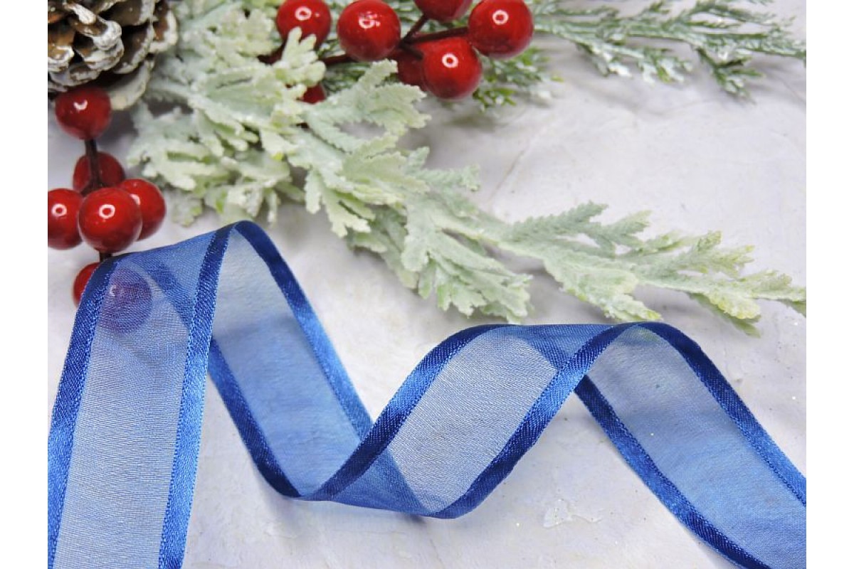Лента органза с атласом 25 мм по середине полоска, цв. синий - 1 м.