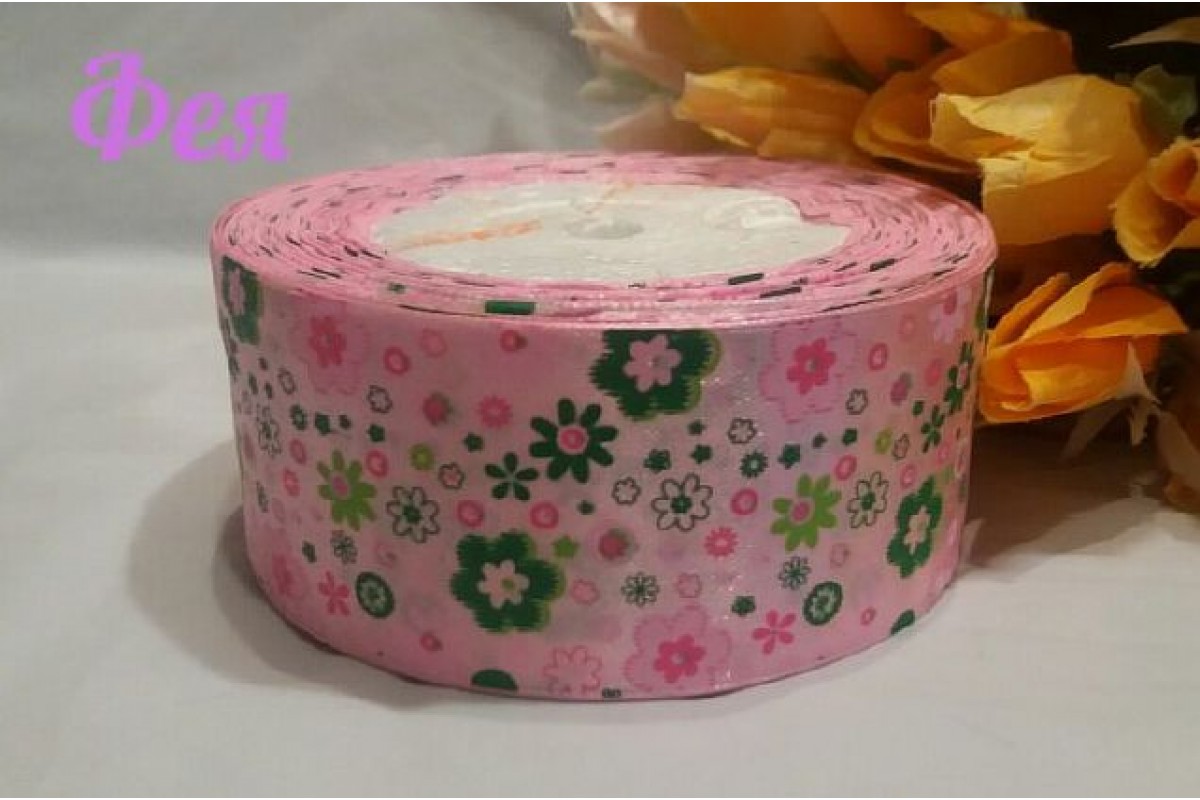 Атласная лента с рисунком 40мм, цв. розовый с цветочками