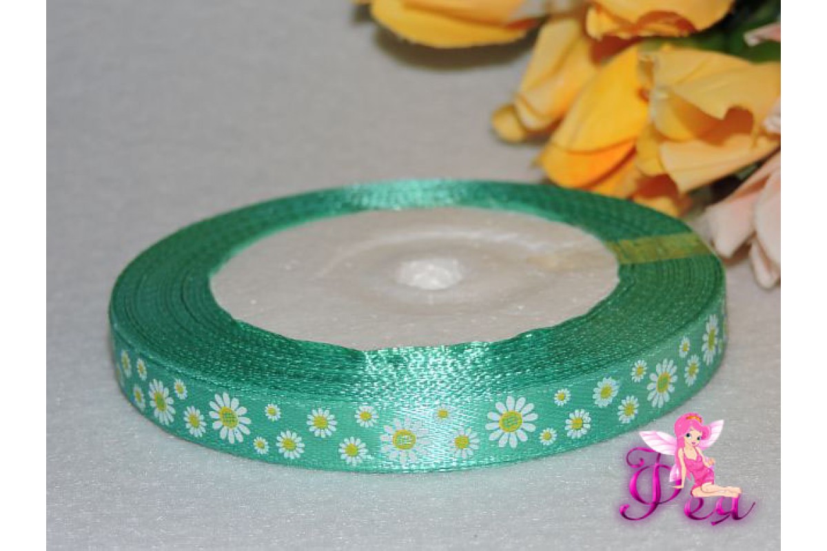 Атласная лента бирюзового цвета с рисунком "Ромашки"
