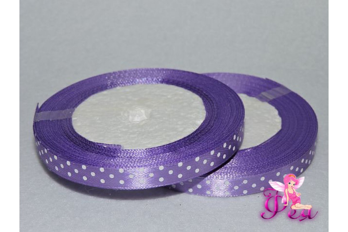 Лента атласная 10 мм фиолетового цвета в рисунок "Мелкий белый горох"