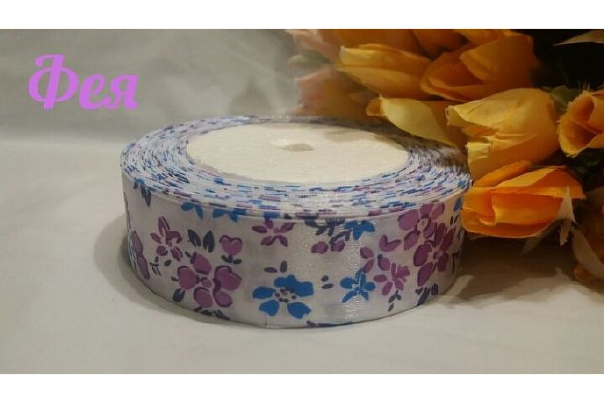 Купить атласную ленту белого цвета с рисунком "Цветы"(голубые,фиолетовые) Вы можете в нашем интернет-магазине