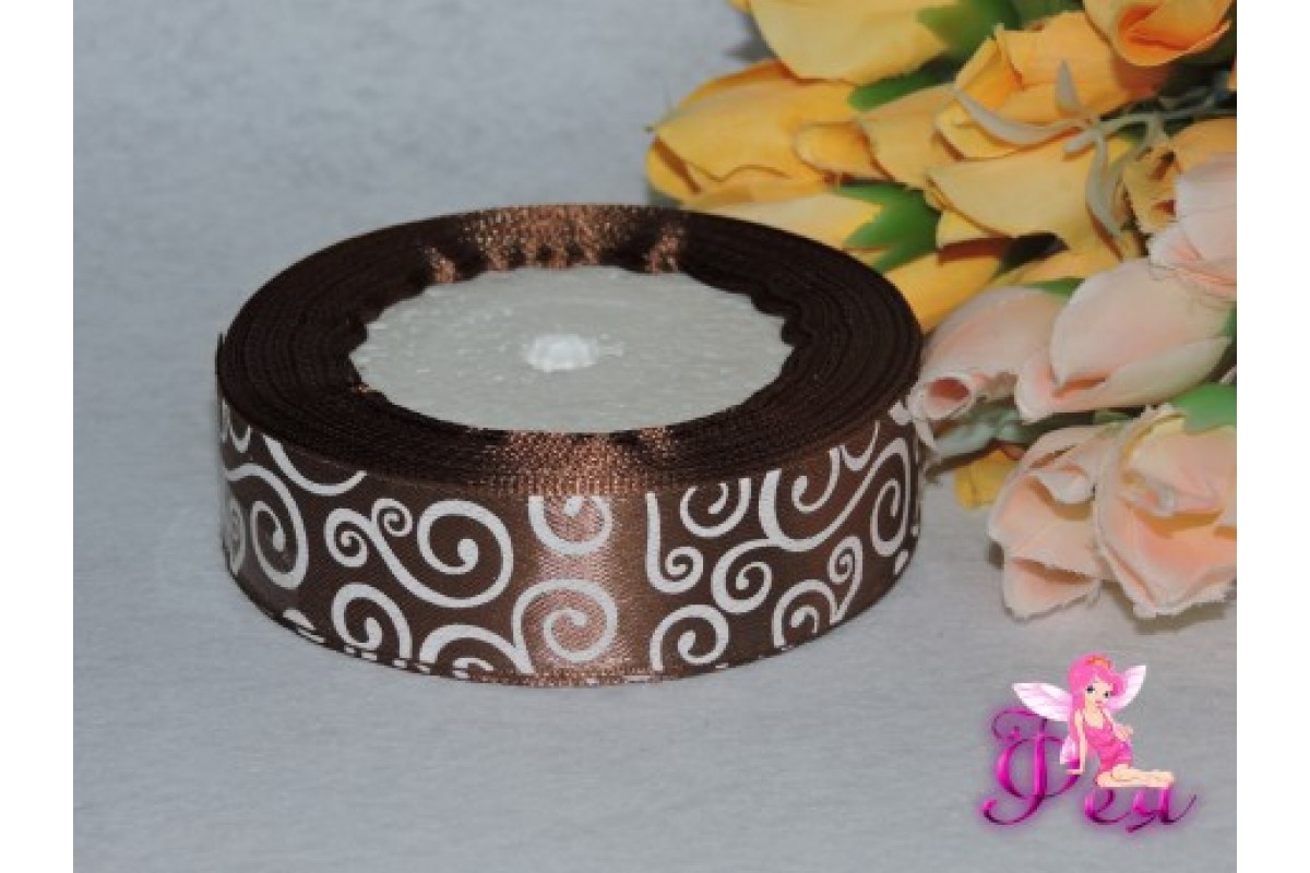 Атласная лента 25 мм коричневого цвета с рисунком "Завитки"