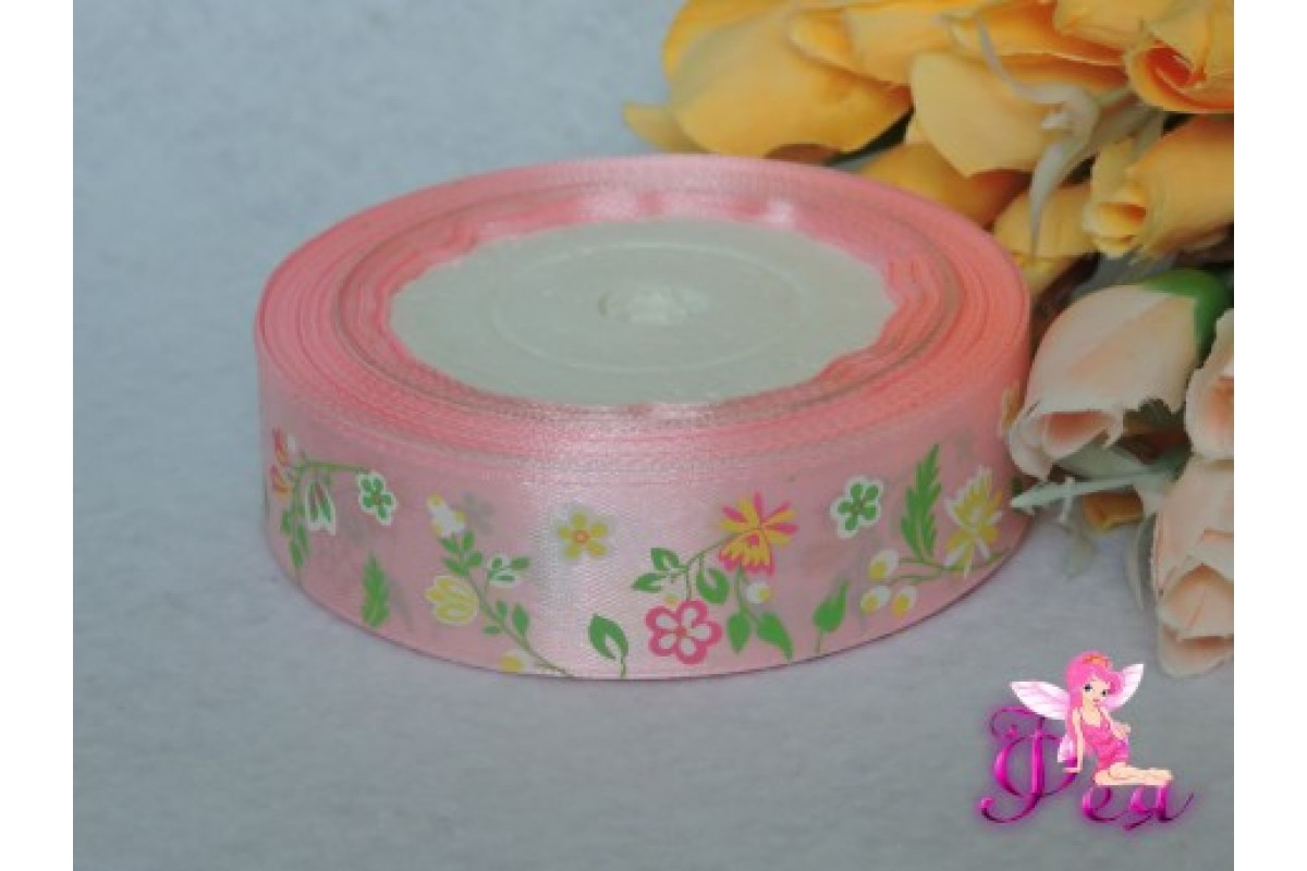 Атласная лента 25 мм нежно-розового цвета с рисунком "Полевые цветы"