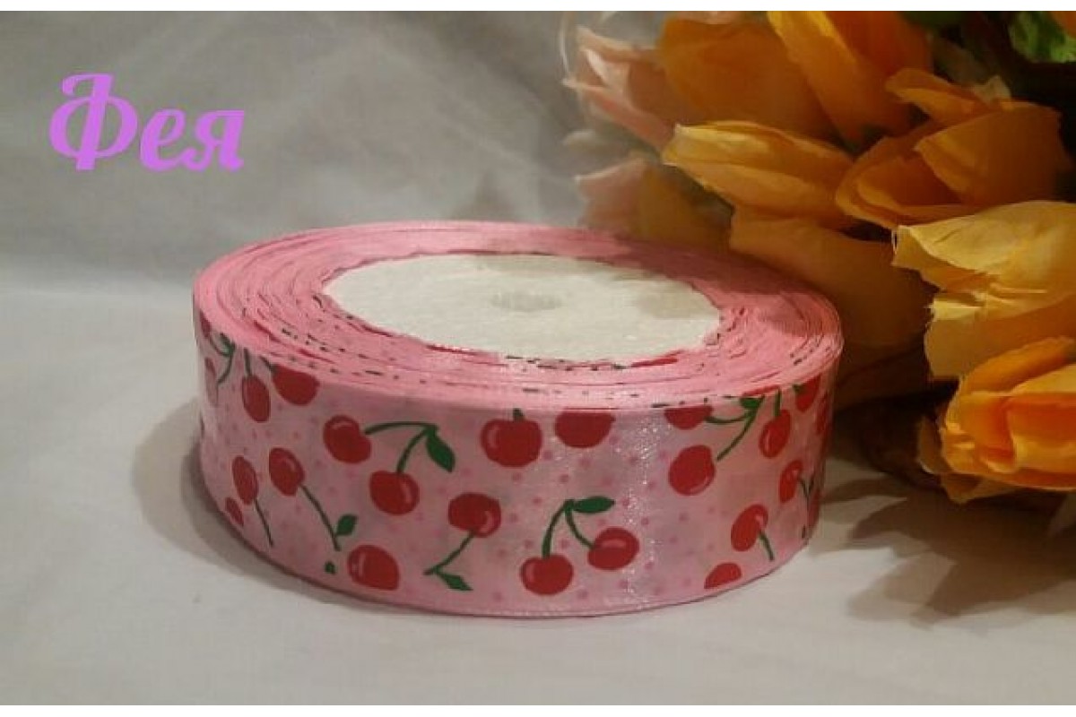 Атласная лента 25 мм нежно-розового цвета с рисунком "Вишенки"