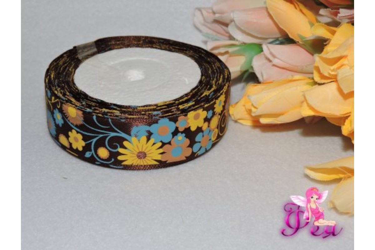 Атласная лента 25 мм с рис. "Цветы" цв. шоколадный