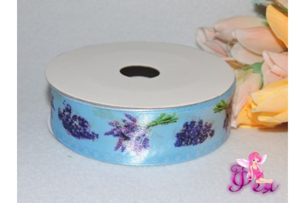 Атласная лента 25 мм с рис. "Лаванда", цв. голубой
