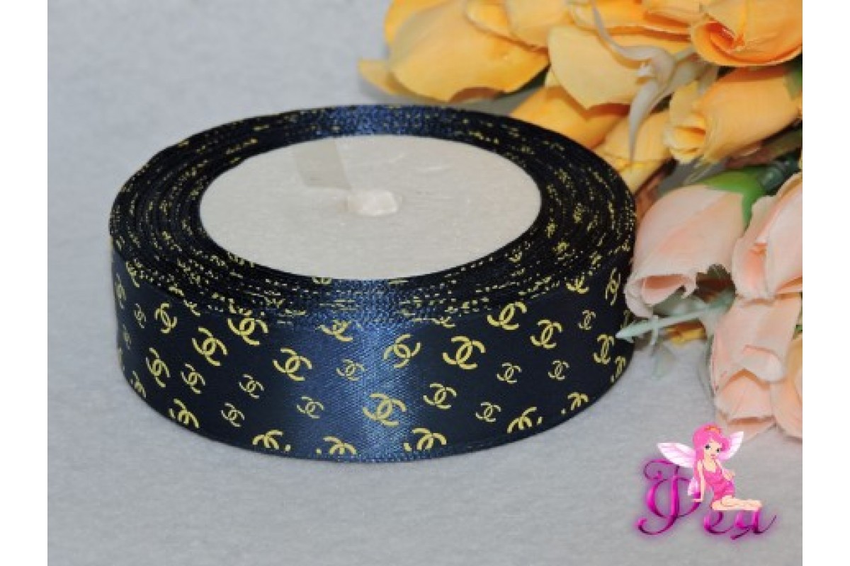 Атласная лента 25 мм темно-синего цвета с рисунком "Шанель золото"