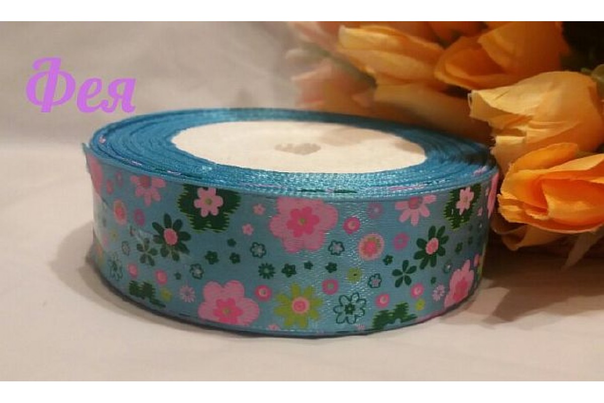 Атласная лента 25мм с рисунком "Разноцветные цветы" на голубом фоне, F 1/4/13, Китай, 25 мм