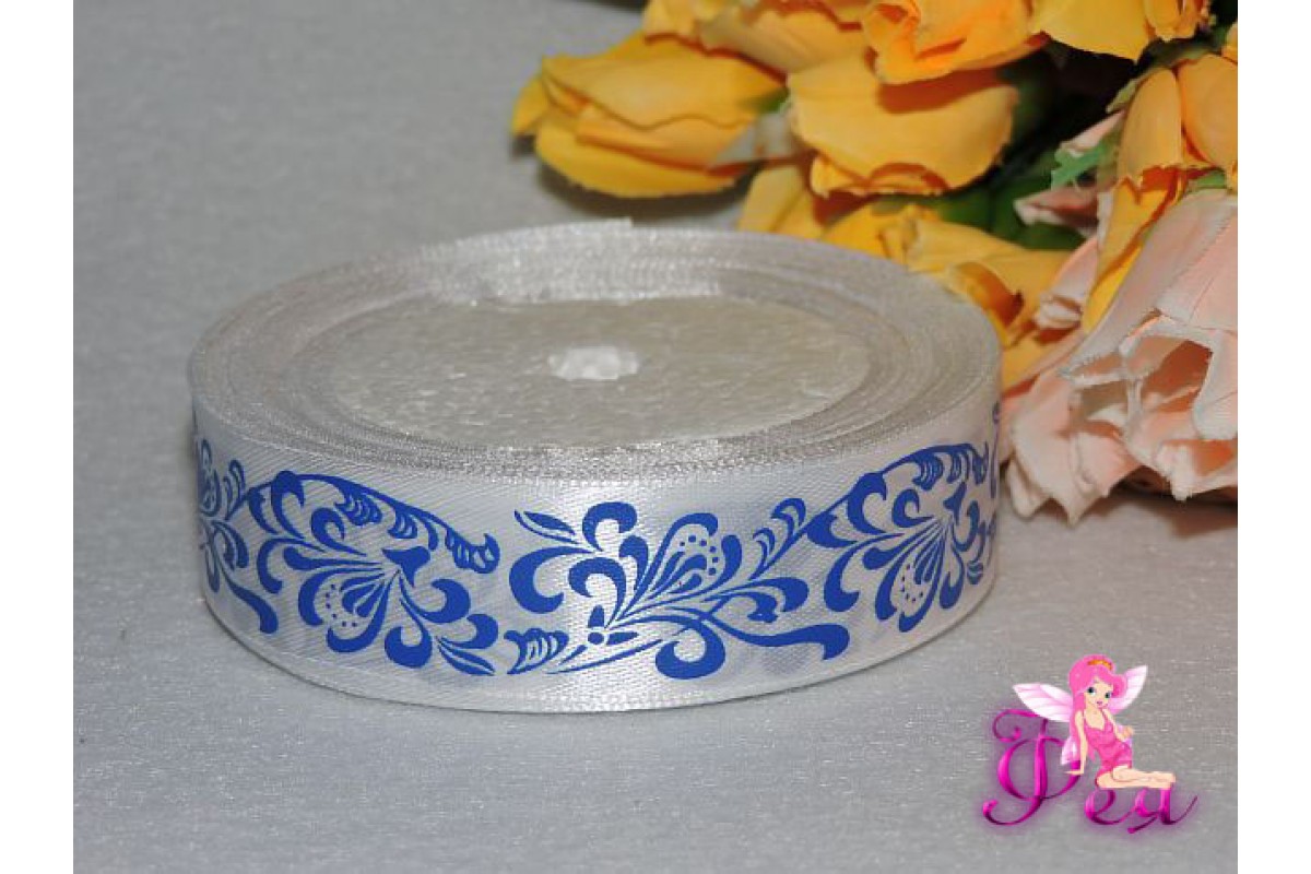 Атласная лента с рисунком 25мм белого цвета с рисунком "Синий узор"