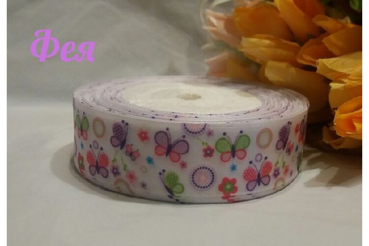 Атласная лента с рисунком белого цвета в "Бабочки" (мультики, 3D) 25мм