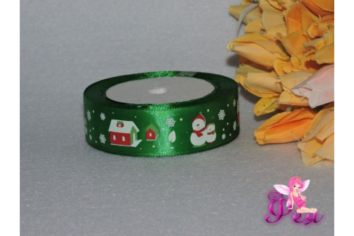 Атласная лента "Снеговик" 25 мм, цвет зеленый