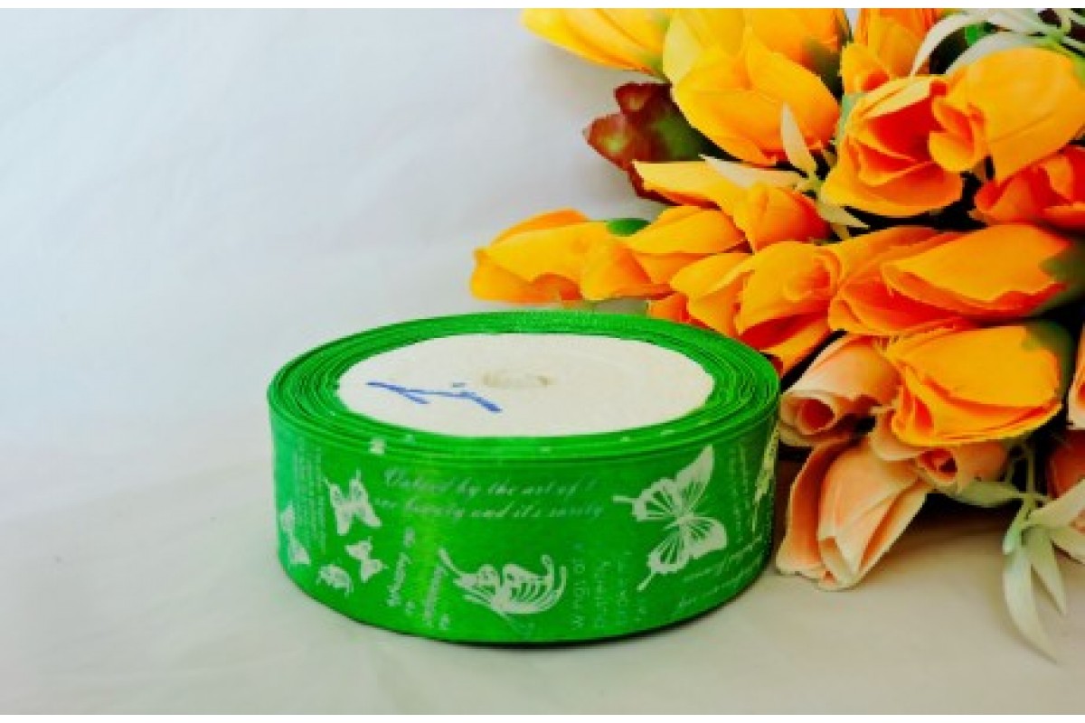 Лента атласная с рисунком, 25 мм* 23 м, цв. зеленый с бабочками и надпись