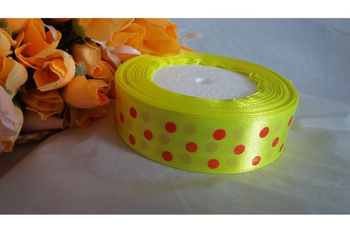 Атласная лента 25 мм светло-желтого цвета с рисунком "Крупный красный горох"