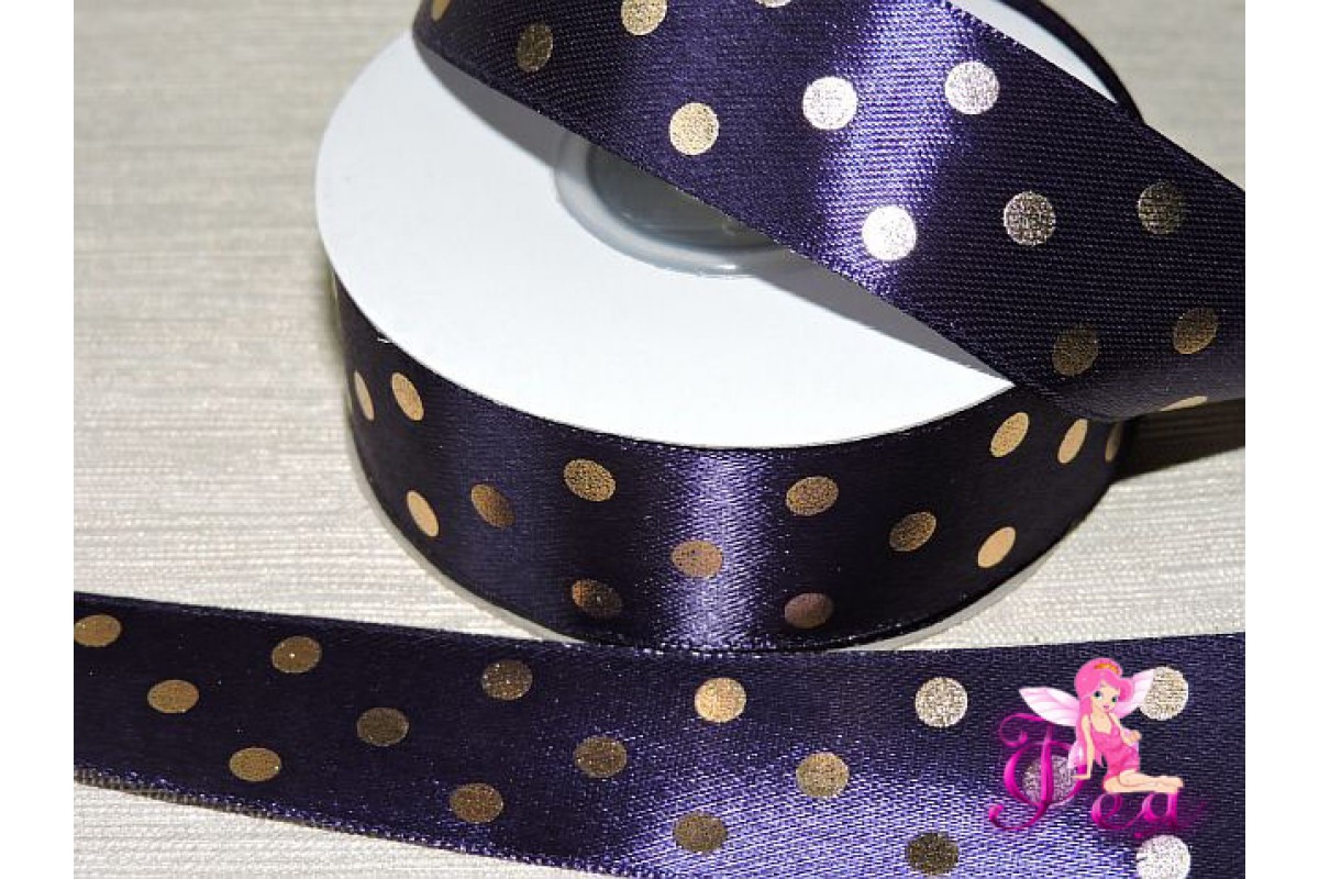 Атласная лента 25 мм в горошек золотой, цв. фиолетовый, 476, Россия, в горох