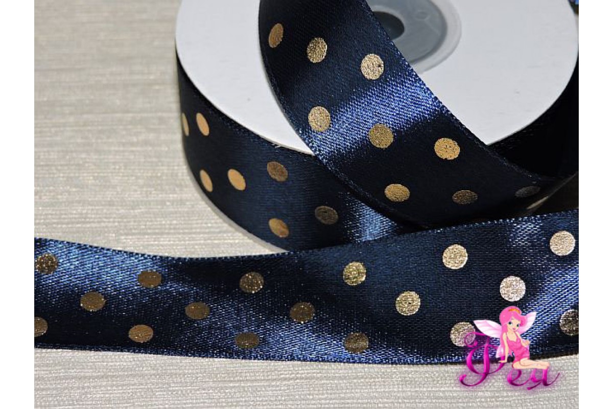 Атласная лента 25 мм в горошек золотой, цв. синий