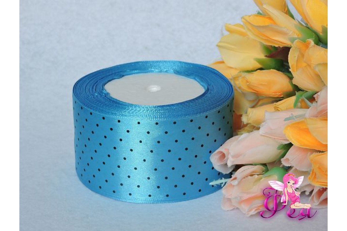 Атласная с рис. горох 50мм голубого цвета, F 150/290, Китай, в горох