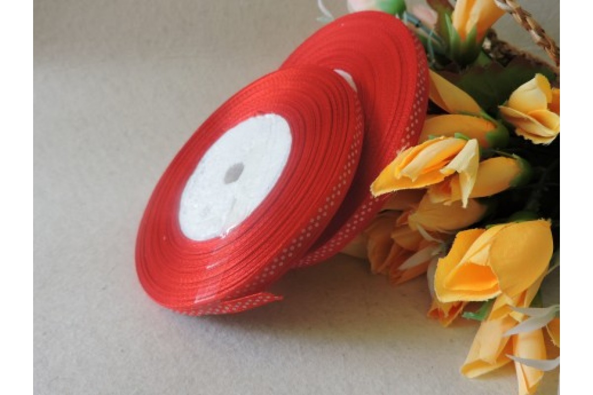 Атласная с рис. горох 6мм*45м, красного цвета с рисунком "Мелкий белый горох"