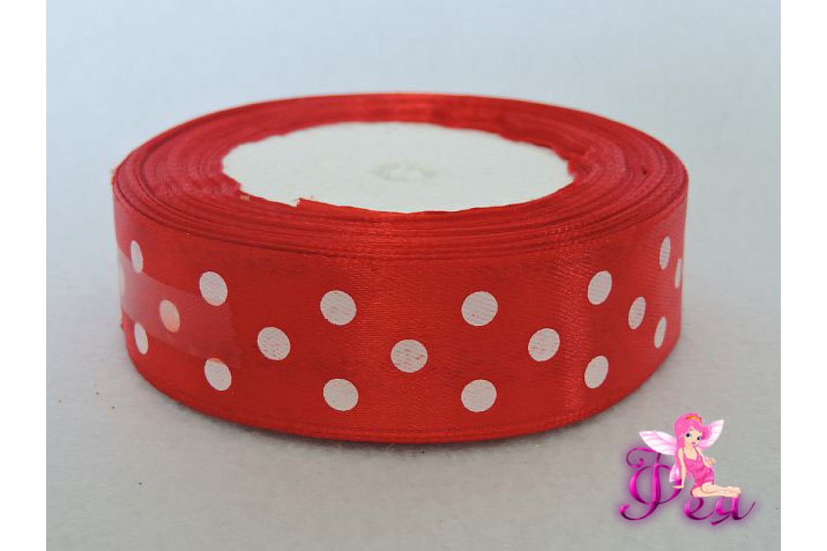 Лента атласная 25 мм красного цвета с рисунком " Крупный белый горох"