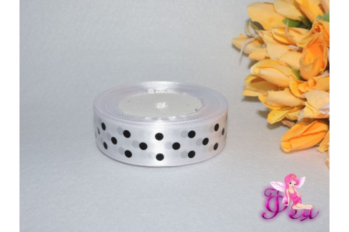 Лента атласная 25 мм "Крупный черный горох" цв. белый - 1м