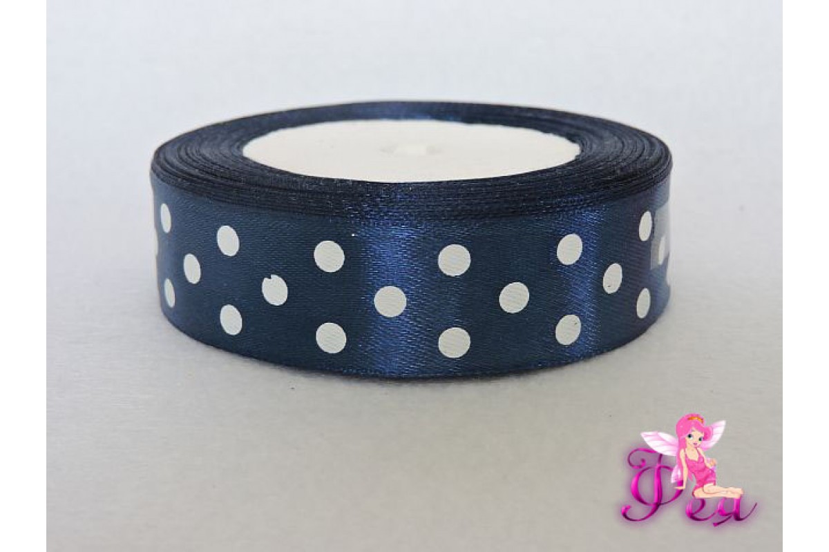 Лента атласная 25 мм темно-синего цвета с рисунком " Крупный белый горох"