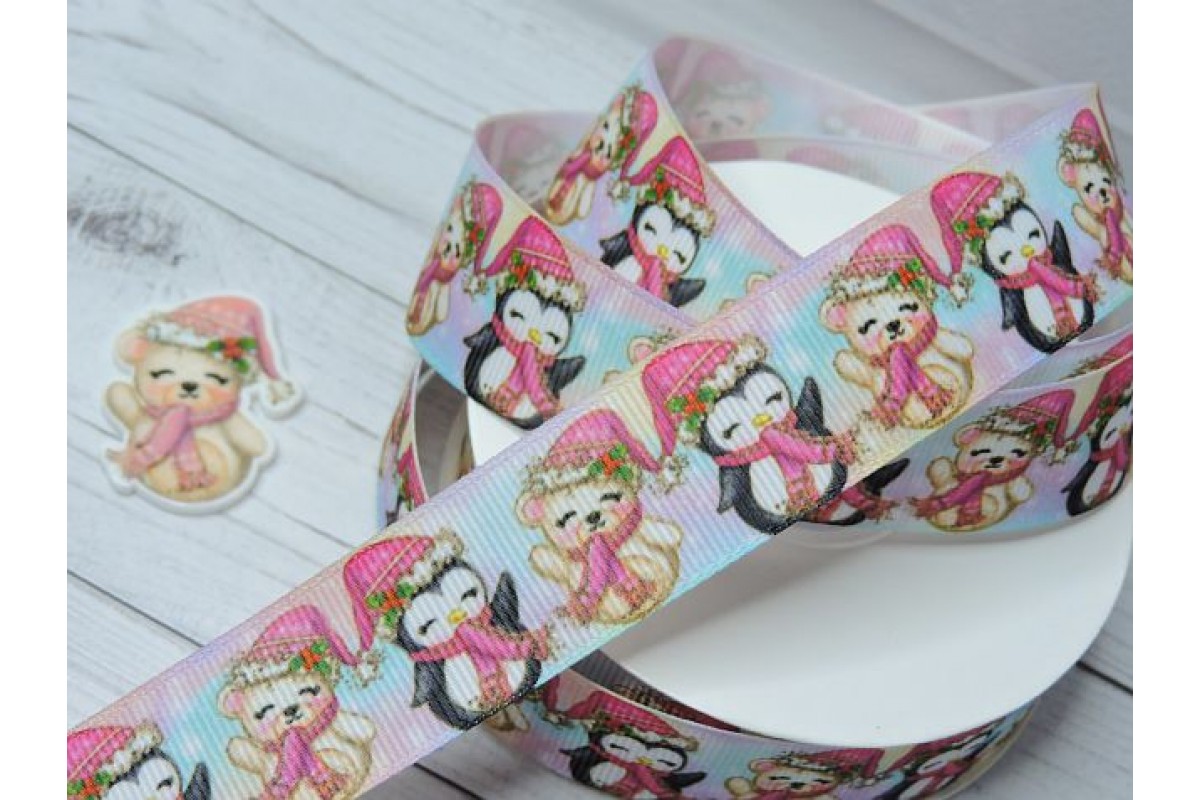 10038, Лента репсовая 25 мм с рисунком "Пингвинчик и мишка" - 1 м., , 1.16BYN, 126-365 нов, Китай, 25 мм