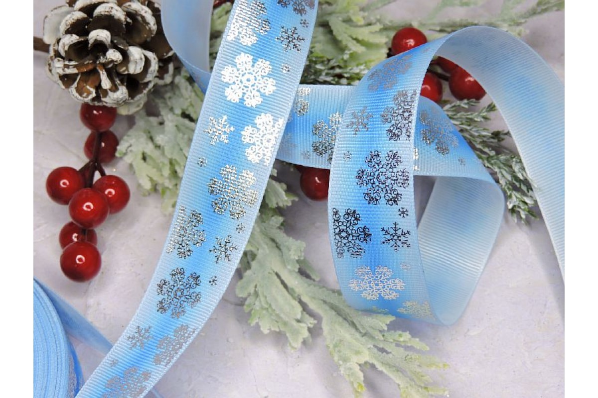 10997, Лента репсовая 25 мм с рисунком "Серебряные снежинки", цв. светлоголубой - 1 м., , 1.40BYN, 030509907, Россия, 25 мм