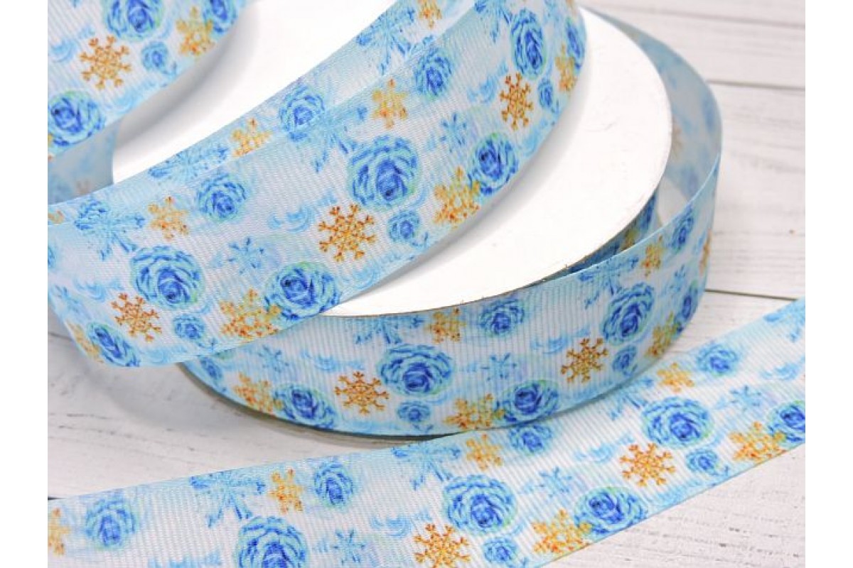 Лента репсовая 25 мм с рисунком"Снежинки и розочки" - 1 м.