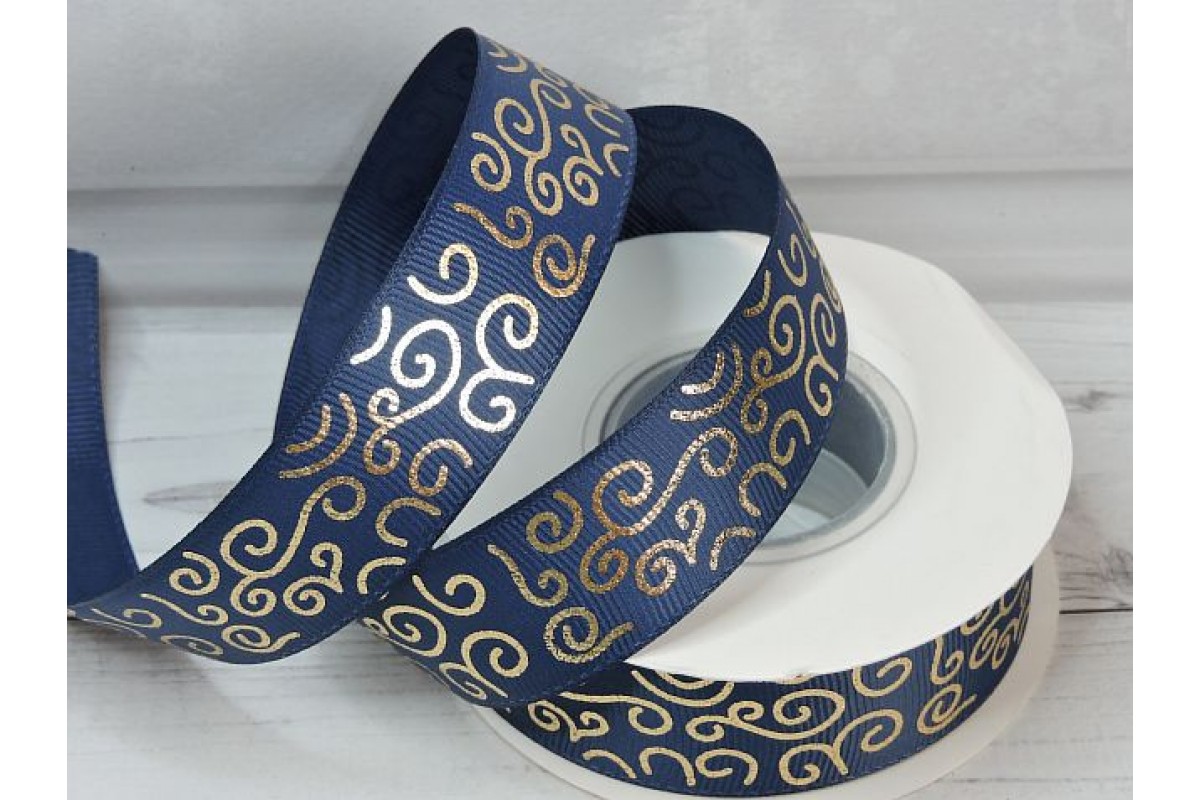 Лента репсовая 25 мм с рисунком "Узор", цв. темно-синий/золото - 1 м., 126-149, Китай, 25 мм